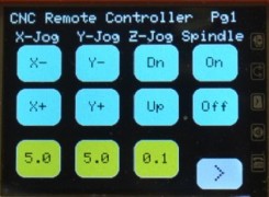 X Y and Z axes can be jogged in either direction using predefined distances, and the spindle can be turned on and off. A status screen is displayed briefly as each command is executed. Select the jog distance by tapping the corresponding yellow button. Jogging speed is set on the Settings page.