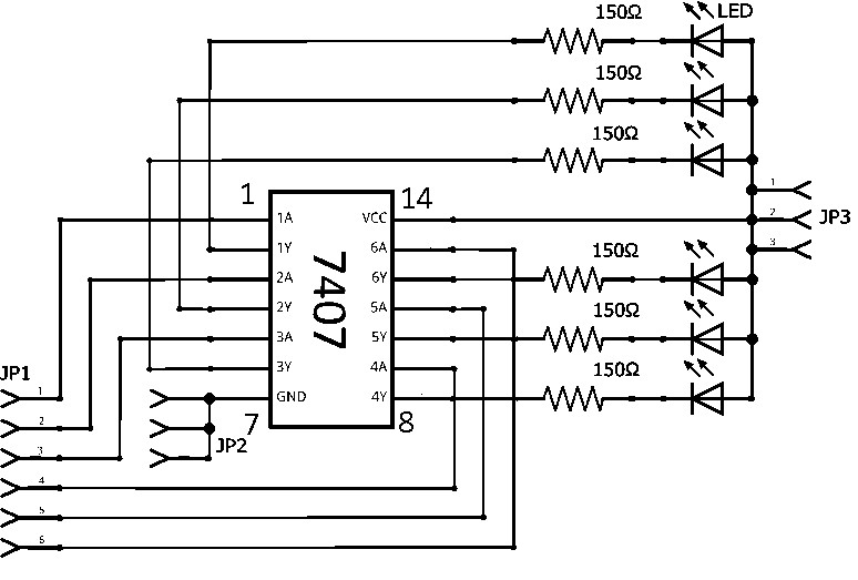In this configuration the LED driver voltage is the same as the 7407 supply voltage, that is, 5V at pin 14. The alternative arrangement is to disconnect JP3 from pin 14, supply 5V separately to pin 14, and connect the alternate LED supply voltage to JP3. This alternate supply must be no greater than 30V, and LEDS+resistors, or relays or whatever other device is used must be capable of handling the higher voltage. There must be a common ground between each supply, the test unit and the MCU.